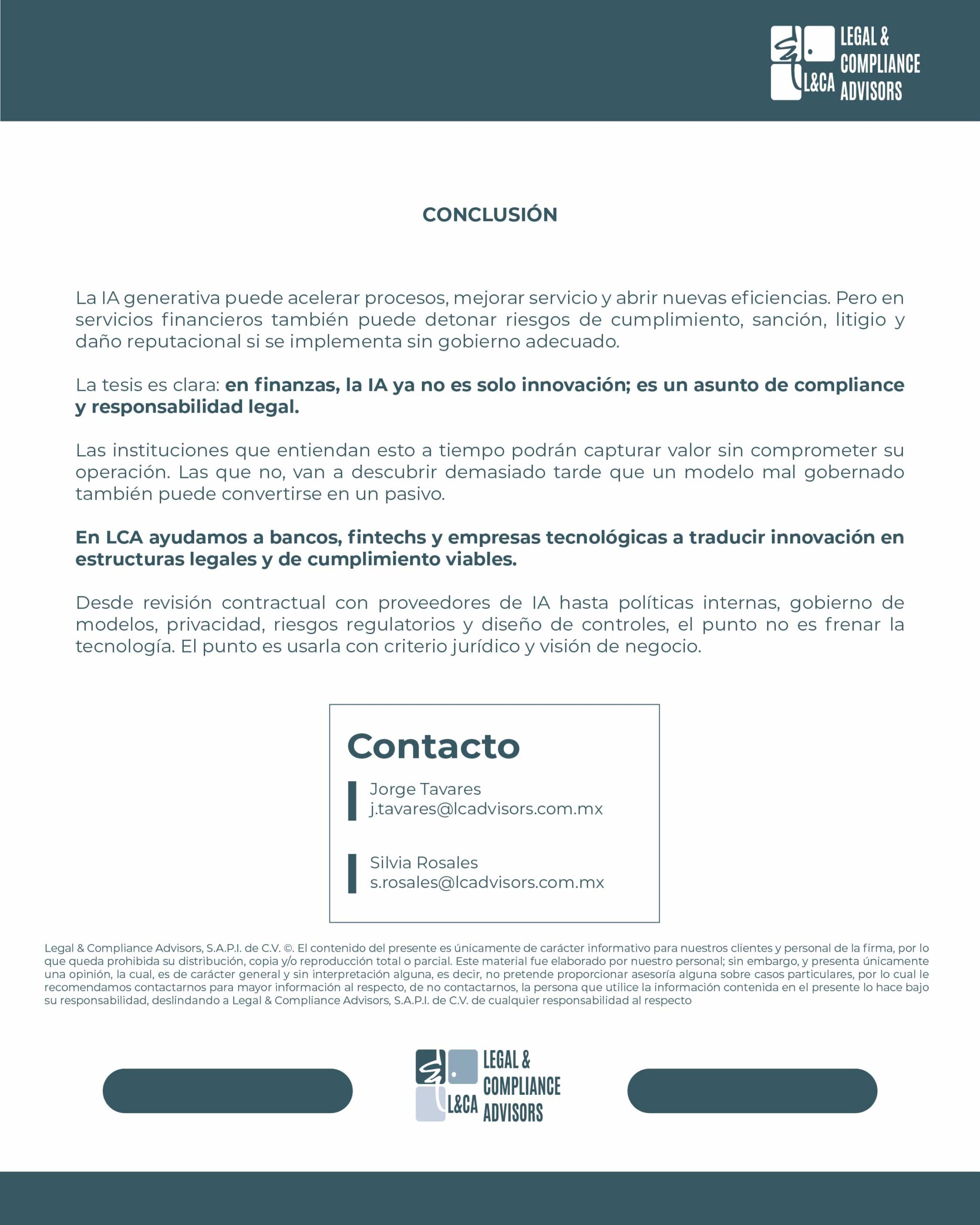 parlamentario. Pero incluso antes de que exista una ley general plenamente desarrollada, el estándar regulatorio ya cambió en la práctica: hoy se espera que las entidades financieras usen tecnología con controles, documentación y responsabilidad.