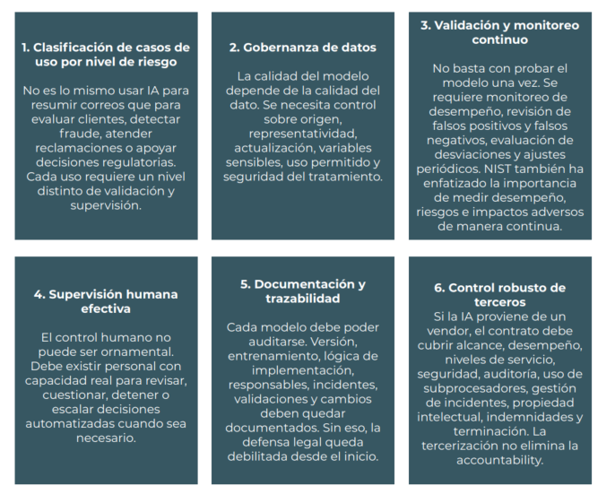 Una institución financiera que utiliza IA de forma seria debería tener, como mínimo, estas líneas de control: